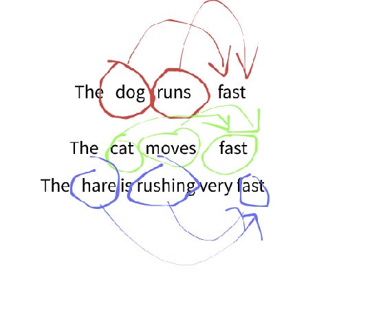 Language models generally learn this in a similar way. Take a look at the following example using a 3-sentence dataset: