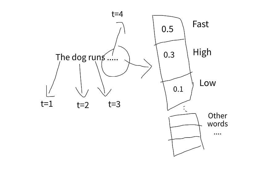 Here’s a simple example: the goal is to generate the distribution vector for t=4, based on the words at positions t=1, 2, and 3. As humans, we know the correct word is “Fast,” but we want the machine to learn this on its own.