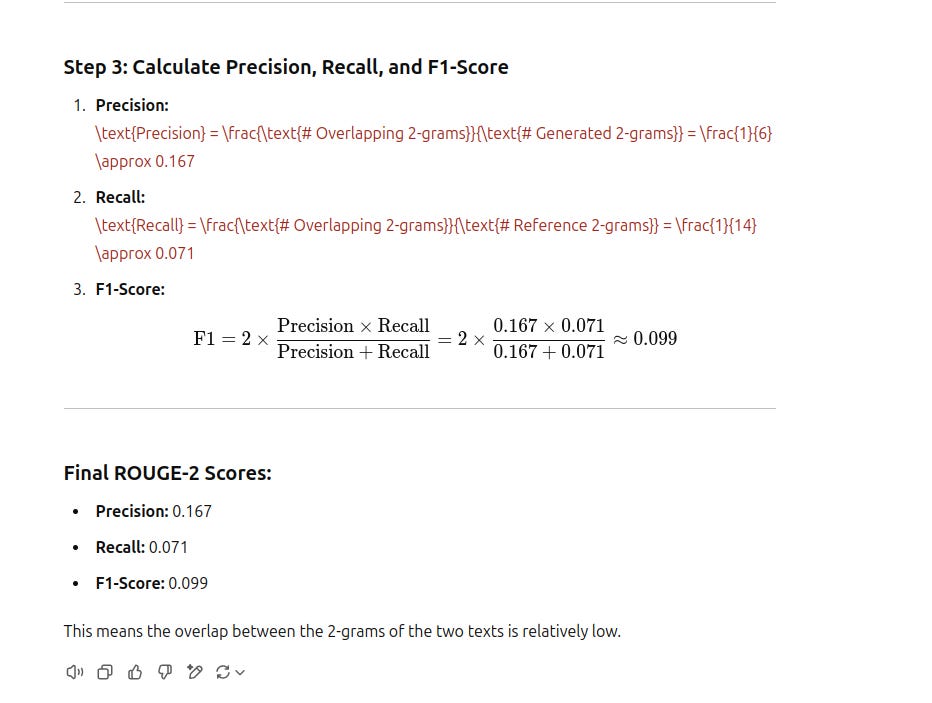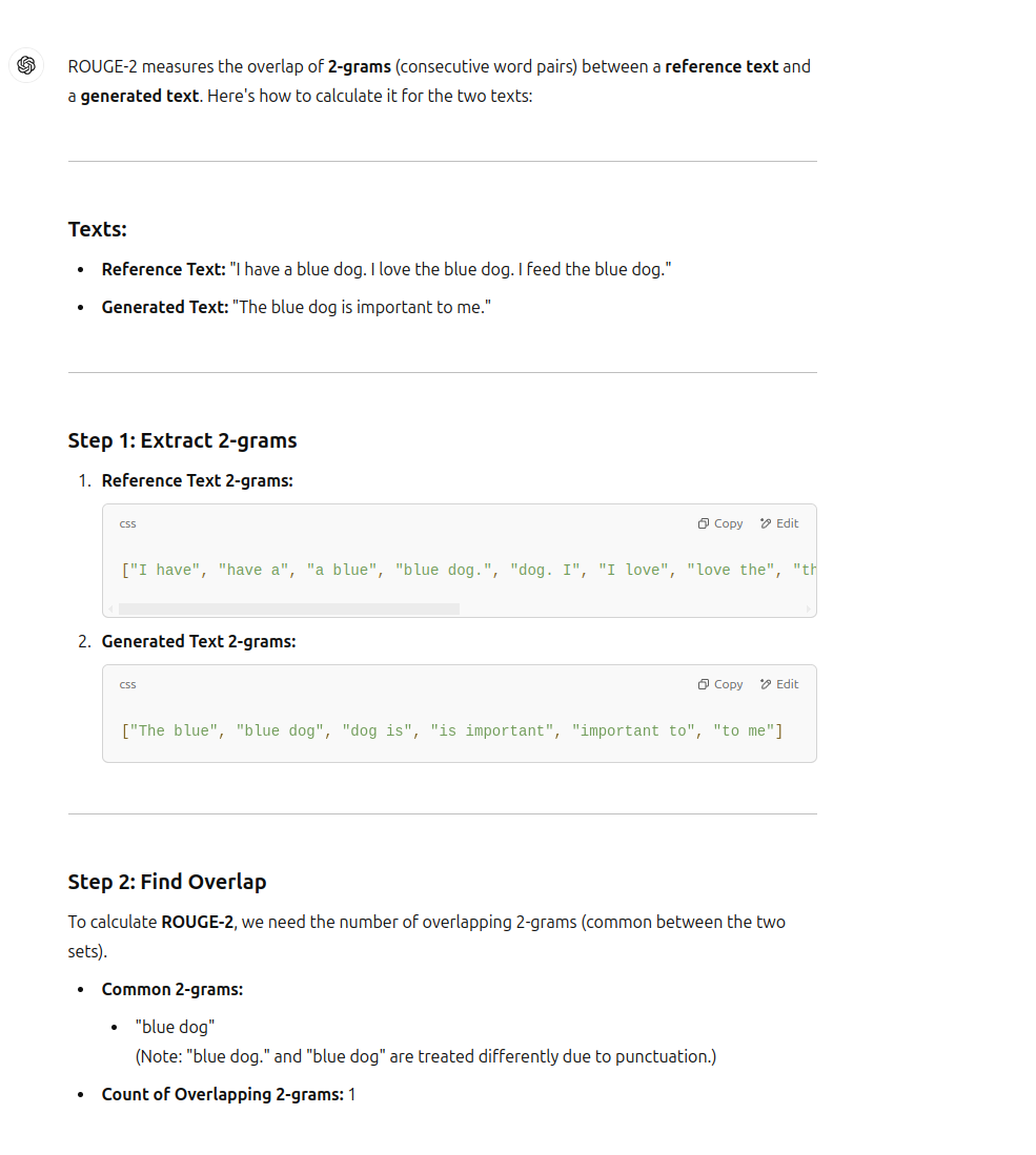Now we have a complete overview of how ROUGE is calculated. In the next article, I will show a real-world example to evaluate how ROUGE can be used to evaluate financial report summarization. Stay tuned